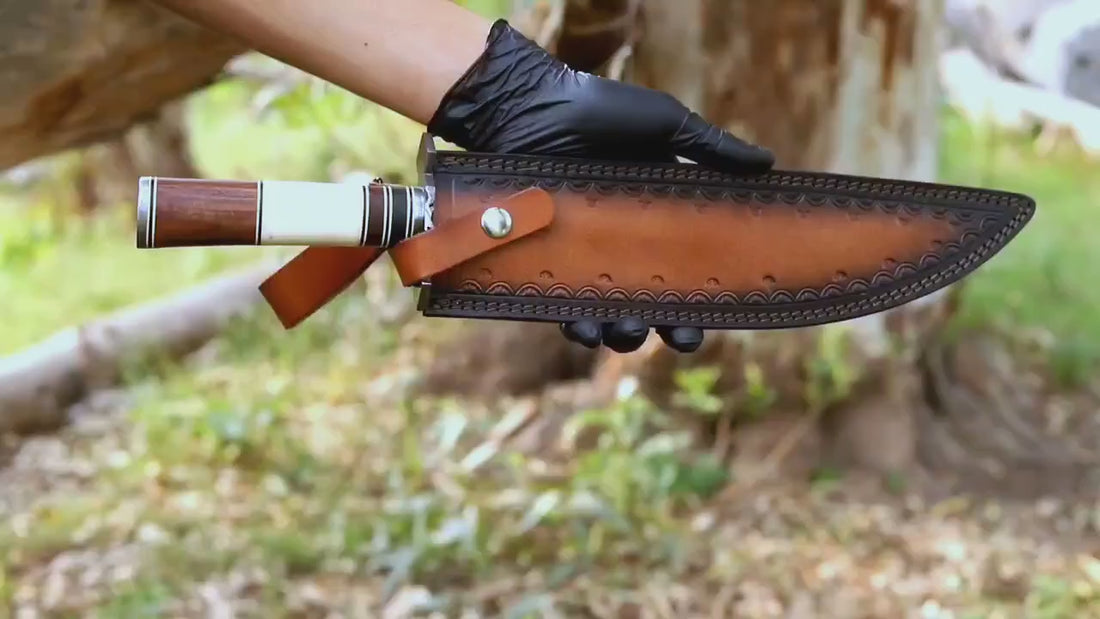 With an overall length of 17 inches, including a 12-inch blade and 5-inch handle, the Frontier Spirit Bowie Knife offers commanding power without sacrificing precision. Each knife is handcrafted by skilled artisans, guaranteeing that every piece is unique — no two Damascus patterns or handle grains are ever the same.